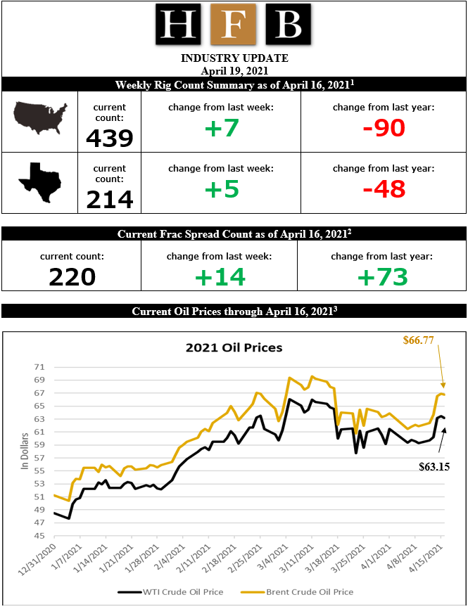Thumbnail Image [1]Rig Count Overview & Summary Count as of April 16, 2021, BAKER HUGHES, https://rigcount.bakerhughes.com/rig-count-overview (last visited 04/19/2021); North America Rig Count, BAKER HUGHES, https://rigcount.bakerhughes.com/na-rig-count (last visited 04/19/2021) (follow “Rigs by State – Current and Historical” link; then scroll to the appropriate timespan). [2] U.S. Frac Spread Count as of April 16, 2021, https://www.aogr.com/web-exclusives/us-frac-spread-count/2021. [3] MacroTrend Brent Crude Oil Prices 10 Year Daily Chart, https://www.macrotrends.net/2480/brent-crude-oil-prices-10-year-daily-chart; MacroTrend WTI Crude Oil Prices 10 Year Daily Chart, https://www.macrotrends.net/2516/wti-crude-oil-prices-10-year-daily-chart (last visited 04/19/2021); Markets Business Insider https://markets.businessinsider.com/commodities/oil-price?type=wti?utm_source=markets. [4]https://www.eia.gov/petroleum/weekly/crude.php [5]https://markets.businessinsider.com/commodities/natural-gas-price (last visited April 19, 2021).